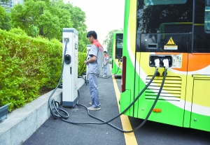 充電中的電動(dòng)公交車(chē)。廣報(bào)記者駱昌威攝(資料圖片)