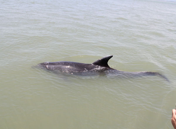 5月30日上午8時(shí)許,在海陵灣陽江港附近海灘游玩的群眾看到海灘上有一只受困的黑色海豚,迅速報(bào)警求助。看到海豚身體露在水外,可能有生命危險(xiǎn),群眾一起將海豚往水里推了十幾米,但海豚仍不能游回大海,只能在近海淺水里慢速游動(dòng)。