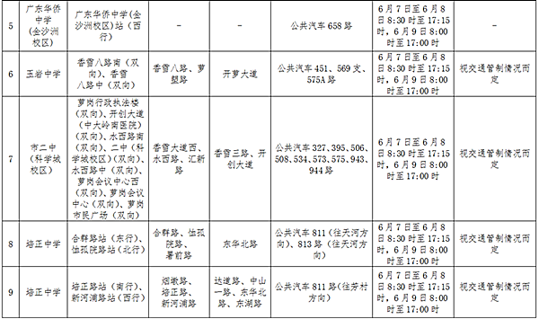 一、6月7日至6月9日,每日8:30至17:15(6月9日為8:00至17:00),廣州市交通部門將臨時撤銷公共汽車寶崗大道北站(南行)、大新路站(西行)、環(huán)洲二路站(雙向)、廣東華僑中學(xué)(金沙洲校區(qū))站(西行);臨時撤銷公共汽車合群路站、恤孤院路站、培正路站、新河浦路站;公共汽車813路往海珠方向臨時取消?抗财囘_道路站(南行)。