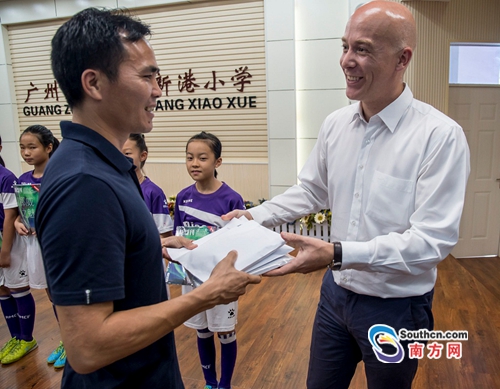 南方網(wǎng)訊 因?yàn)橛?xùn)練,廣州新港小學(xué)的小隊(duì)員們的皮膚呈現(xiàn)出健康的小麥色,看到挪威國會(huì)議員和挪威駐穗領(lǐng)事館領(lǐng)事,他們老遠(yuǎn)就熱情地喊"Hello"!6月6日,“挪威杯-中國廣州分享會(huì)”在廣州黃埔區(qū)新港小學(xué)舉行,記者獲悉,這是廣州首次有學(xué)校派隊(duì)參加這個(gè)世界上最大的青少年足球錦標(biāo)賽。