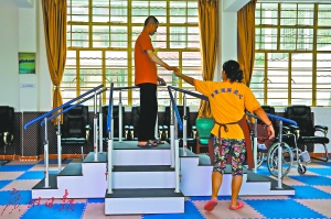 護(hù)工幫助殘疾人做物理康復(fù)治療。