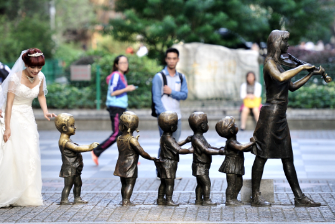 雕塑是關于一座城市的記憶。當你信步徜徉在廣州CBD的高樓大廈間,隨時可能與一尊尊大師作品不期而遇。這些生動形象的雕塑讓人一下子記住廣州,愛上廣州。圖為夏日的沙面,一對新婚夫婦跟在一群雕塑娃娃后頭,聆聽幸福的音符。(廣報全媒體記者 邵權達 攝影報道)