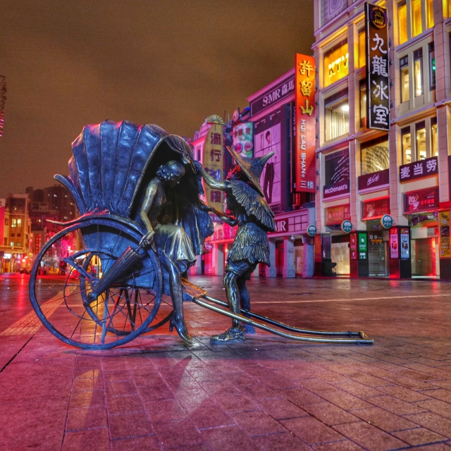 夜色中的上下九步行街上,雕塑《黃包車》勾起老廣州百年歲月的回憶。