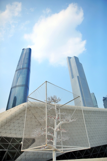 廣州大劇院的雕塑作品《樹》,一群鳥兒抬頭仰望珠江新城東塔和西塔。