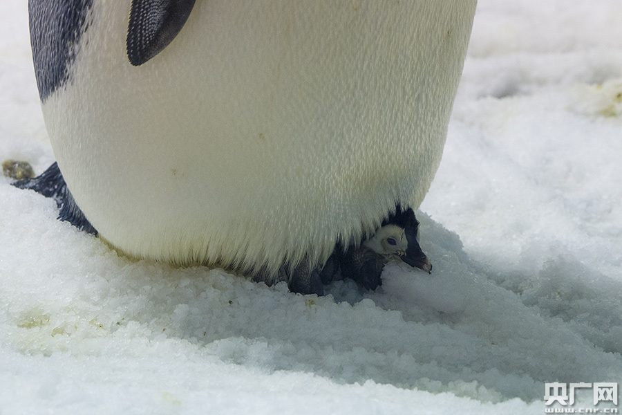 藏在爸爸育兒袋中的小帝企鵝 -