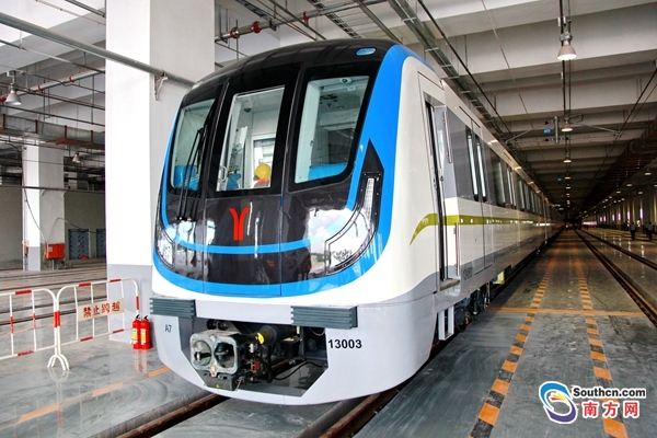 據(jù)南方網(wǎng)報(bào)道,經(jīng)過(guò)10多天兩千多公里的長(zhǎng)途跋涉,28日,十三號(hào)線(xiàn)首列8節(jié)編組列車(chē)抵達(dá)廣州地鐵官湖車(chē)輛段。