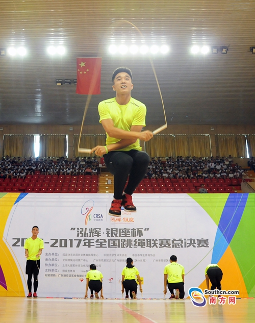 南方網(wǎng)訊 7月9日,2016-2017年全國跳繩聯(lián)賽總決賽開幕式在廣州市花都體育館開賽。1300名來自全國各地的跳繩運動員齊聚花都,展開了高水平的競技。其中,在男子30秒單搖的比賽中,主場作戰(zhàn)的花都“跳繩小子”岑小林跳出了雙腳226次的成績,再破由自己保持的世界紀錄。