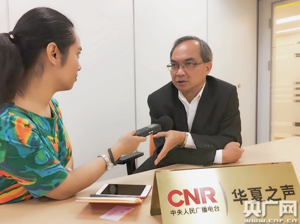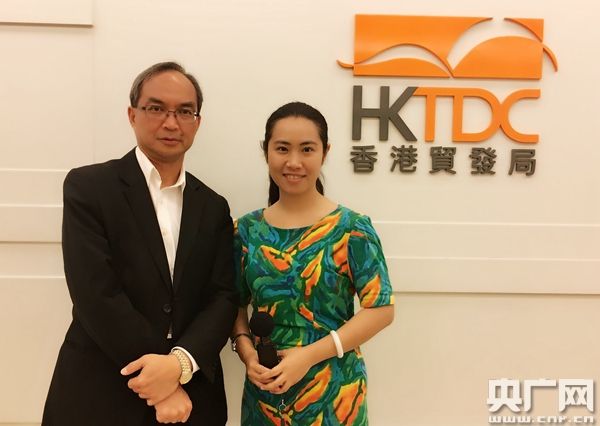 香港貿(mào)易發(fā)展局研究總監(jiān)關(guān)家明先生接受央廣記者陳菲專訪,攝影周晴。