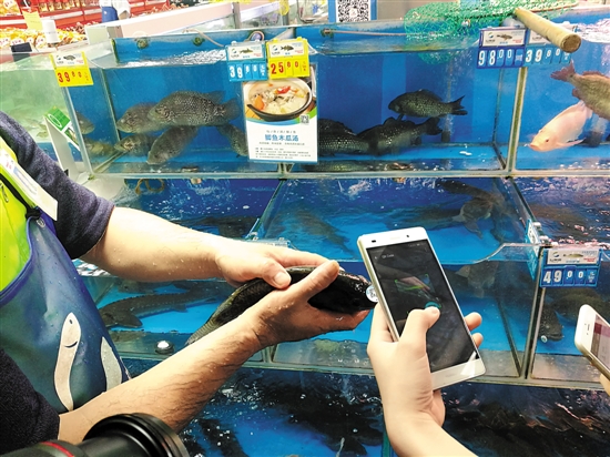超市里的魚用手機掃碼可追溯產(chǎn)地信息 羊城晚報記者 陳澤云 攝