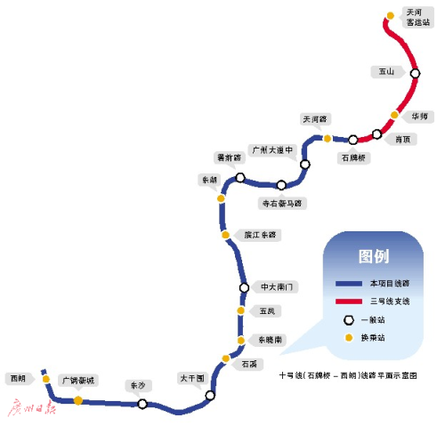 線路圖顯示,十號線共設(shè)置14座車站,其中換乘站8座,分別為天河路(換乘一、三號線)、東湖(換乘六、十二號線)、濱江東路(換乘十九號線)、五鳳(換乘十一號線)、東曉南(換乘二號線)、石溪(換乘廣佛線)、廣鋼新城(換乘佛山十一號線)、西朗(換乘一、二十二、廣佛線)。