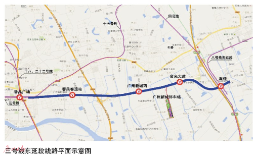 三號線東延段(番禺廣場-海傍)全長9.58公里,均為地下線。線路西起于三號線番禺廣場站,沿亞運(yùn)大道向東延伸,共設(shè)4座車站,自西往東依次為番禺客運(yùn)站、廣州新城西、金光大道和海傍。其中換乘站1座,為海傍站,可換乘已通車的四號線,及遠(yuǎn)期規(guī)劃的八號線南延段。