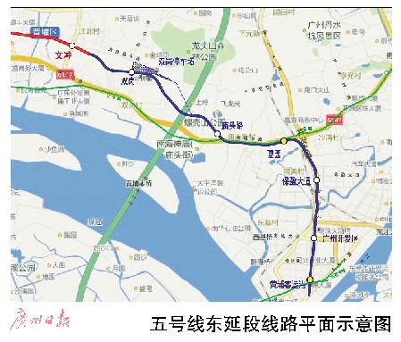 五號線東延段(文沖-黃埔客運(yùn)港)全長9.76公里,全部為地下線。線路西起五號線文沖站,途經(jīng)雙崗、黃埔東路、開發(fā)大道,共設(shè)車站6座(不含文沖),西往東依次為雙崗、廟頭路、夏園、保盈大道、廣州開發(fā)區(qū)、黃埔客運(yùn)港。其中換乘站2座,夏園換乘地鐵十三號線,黃埔客運(yùn)港換乘遠(yuǎn)期規(guī)劃的八號線支線、東莞一號線。