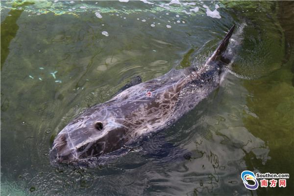 檢查發(fā)現(xiàn)海豚長約2.5米、頭圍1.5米,體重約為150公斤,頭部、右鰭均有外傷。