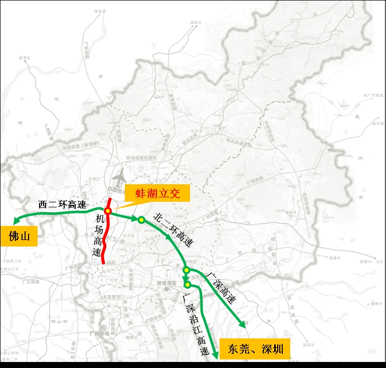 往佛山方向的車輛:機(jī)場(chǎng)高速(蚌湖立交)—西二環(huán)高速—佛山一環(huán)高速—佛山方向
