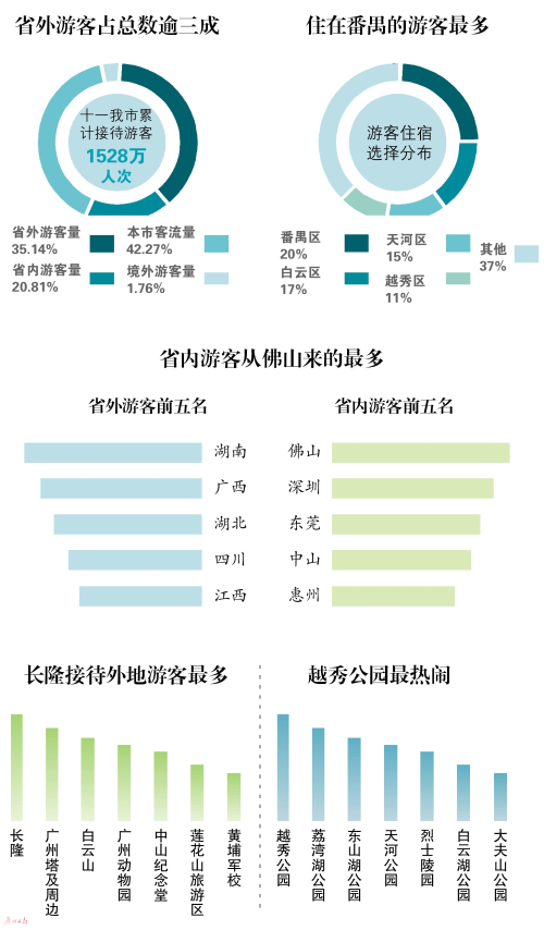 在剛剛過(guò)去的十一假期里,廣州創(chuàng)下史上最旺黃金周,全市國(guó)慶黃金周旅游接待總?cè)舜、旅游業(yè)總收入均呈兩位數(shù)增長(zhǎng),均創(chuàng)歷史新高。那么,省外游客從哪里來(lái)廣州的最多?他們最喜歡住在哪里?哪個(gè)公園最旺?廣州市旅游局發(fā)布大數(shù)據(jù)統(tǒng)計(jì),看看數(shù)據(jù)背后你所不知道的實(shí)情。