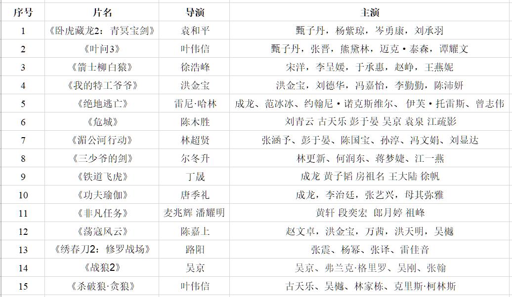 據(jù)介紹,本屆評選范圍涵蓋了2016年至2017年10月的130多部國產動作功夫電影。經過層層篩選,最終確定15部影片入圍,當中包括大家耳熟能詳?shù)摹度~問3》、《絕地逃亡》、《湄公河行動》、《繡春刀2:修羅戰(zhàn)場》以及今年大熱的《戰(zhàn)狼2》。