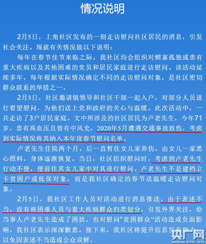 根據(jù)2月6日發(fā)布的情況說(shuō)明,文中所涉及的社區(qū)居民盧老先生,今年71歲,患有高血壓且曾有中風(fēng)史,2020年5月遭遇交通事故致傷,不是建檔立卡貧困戶(hù)或低保對(duì)象,而是該社區(qū)確定的春節(jié)送溫暖走訪(fǎng)慰問(wèn)對(duì)象。