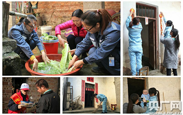 春節(jié)前,15人的志愿服務(wù)隊(duì),再次來(lái)到了水秀村,將紅紅的燈籠掛上村路兩旁,來(lái)到小霞家,幫他們把家里里里外外打掃干凈,把吉祥的鞭炮串兒掛上門(mén)口;他們?cè)诖謇镄麄靼踩秒娭R(shí),慰問(wèn)村里的貧困戶(hù),為他們檢查線(xiàn)路,確保村民們過(guò)一個(gè)溫暖的春節(jié)。