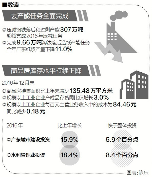 經(jīng)過近一年的實(shí)踐,廣東交出了這樣的成績(jī)單:2016年,廣東實(shí)現(xiàn)地區(qū)生產(chǎn)總值79512.05億元,同比增長(zhǎng)7.5%。這一年,廣東壓減鋼鐵落后和過剩產(chǎn)能307萬噸,超額完成任務(wù);國(guó)有關(guān)停類“僵尸企業(yè)”實(shí)現(xiàn)市場(chǎng)出清2394戶;進(jìn)一步清理規(guī)范行政事業(yè)性收費(fèi),每年為企業(yè)減負(fù)131億元;啟動(dòng)補(bǔ)短板重大工程,將18項(xiàng)、總投資2.25萬億元的補(bǔ)短板重大工程納入省重點(diǎn)項(xiàng)目調(diào)度。