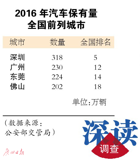 記者統(tǒng)計發(fā)現(xiàn),與2015年相比,2016年上牌量前三的東莞、佛山和惠州,汽車保有量同比去年分別增加了約38萬、25萬和20多萬,保有量增加之和就超過80萬輛。隨著汽車保有量的激增,各城市中心區(qū)的擁堵均明顯加劇。