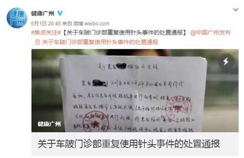 中新網(wǎng)報(bào)道: 日前,廣州市天河區(qū)車陂門(mén)診部被曝存在“小孩抽血一個(gè)針頭兩個(gè)人用”的情況。1日晚,廣州市衛(wèi)生和計(jì)劃生育委員會(huì)通過(guò)官方微博做出通報(bào),通報(bào)稱,該門(mén)診部檢驗(yàn)科為患兒扎手指采血人員黃某存在有用一個(gè)針頭給兩個(gè)人采血的行為。天河區(qū)衛(wèi)計(jì)局經(jīng)過(guò)摸底調(diào)查,排除日常末梢采血技術(shù)操作存在重復(fù)使用針頭的情況。該事件屬檢驗(yàn)人員操作不當(dāng)?shù)膫(gè)案。