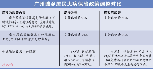 廣州日報訊 城鄉(xiāng)居民大病保險待遇水平大幅度提高了!廣州市人力資源和社會保障局和廣州市財政局近日聯(lián)合發(fā)布《關(guān)于進一步提高廣州市城鄉(xiāng)居民大病醫(yī)療保險待遇的通知》,明確提高城鄉(xiāng)居民大病保險支付比例,并把年度最高支付限額從12萬元提高至40萬元;連續(xù)參加本市城鄉(xiāng)居民醫(yī)保2年及以上的參保人員,年度最高支付限額提高至45萬元。