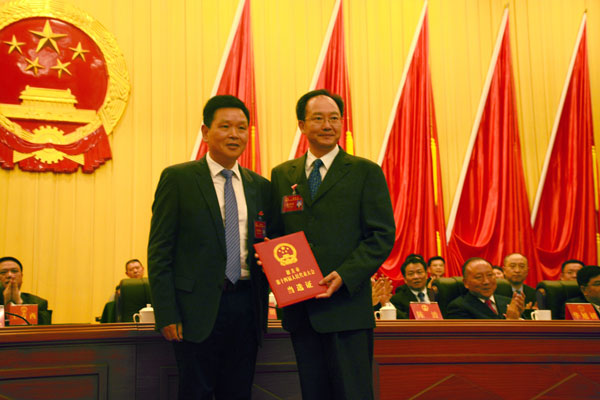 圖為韶關市委書記、市人大常委會主任莫高義向新當選的韶關市市長殷煥明頒發(fā)當選證書