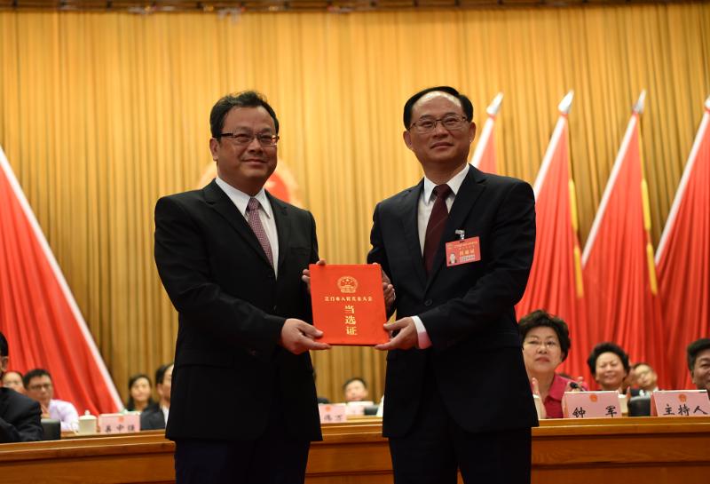 市委書記、市人大常委會主任林應武代表大會主席團為新當選的市長劉毅頒發(fā)當選證,大會全體代表以熱烈的掌聲表示祝賀。