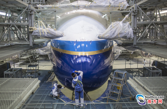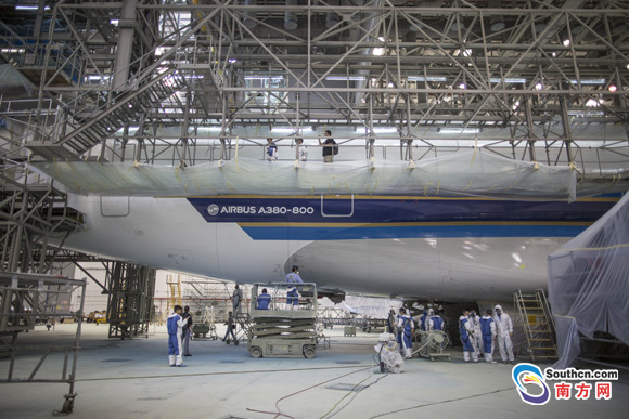 此次噴漆工作標志著南航首架A380的6年定檢進入最后階段,這架A380即將于6月初出廠,重新投入運營。