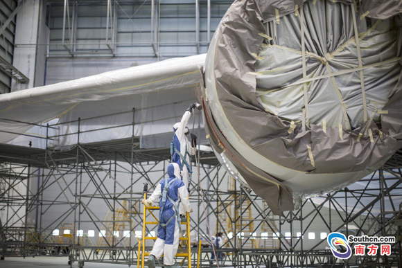 南方網(wǎng)訊 正在首次全面維護的中國首架A380,進入了維護的最后階段——整機重新噴漆。筆者25日在廣州飛機維修工程有限公司車間看見,這個巨無霸“身上”包著一層白膜,局部機身露了出來,穿著防護服的工人正在噴漆。