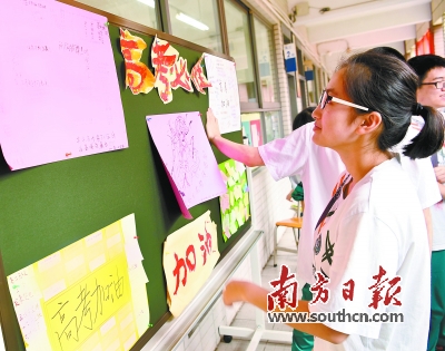 省實(shí)附中的學(xué)生站在貼滿祝福語的展板前。南方日報(bào)記者 王輝攝