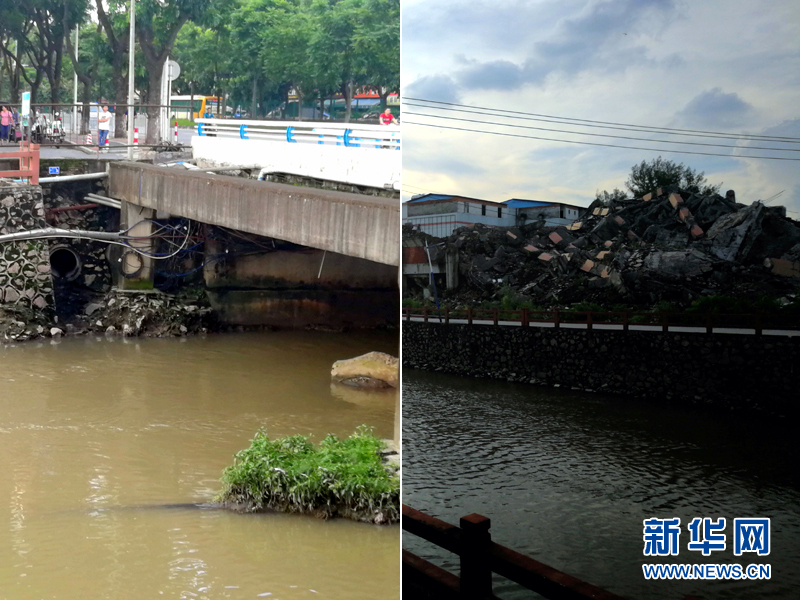 左圖:廣州白云區(qū)白海面涌的雨水口。右圖:白海面涌沿岸正加緊違法建筑清拆。新華網記者 盧鑒 攝