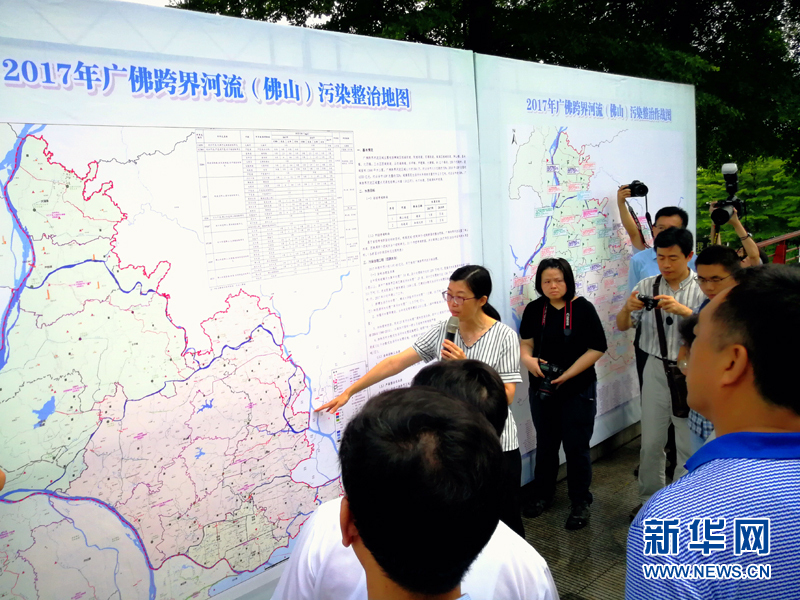 相關負責人在介紹“2017年廣佛跨界河流(佛山)污染整治地圖”。新華網記者 盧鑒 攝