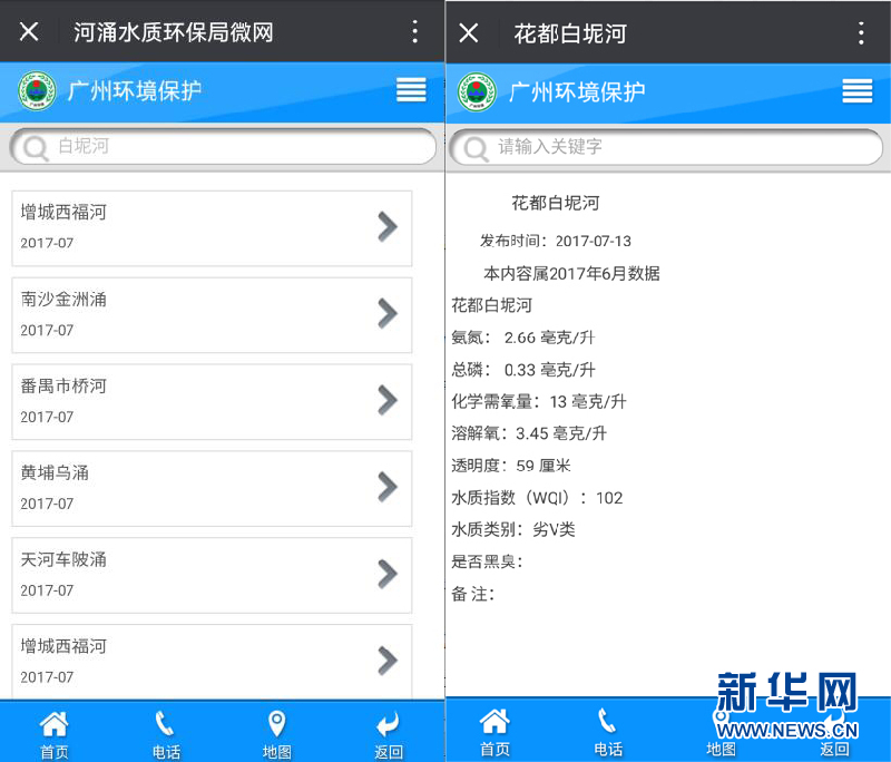 “廣州環(huán)!蔽⑿殴娞柮吭鹿紡V州重點河流水質情況,白坭河2017年6月仍為劣V類水質。新華網記者盧鑒 攝