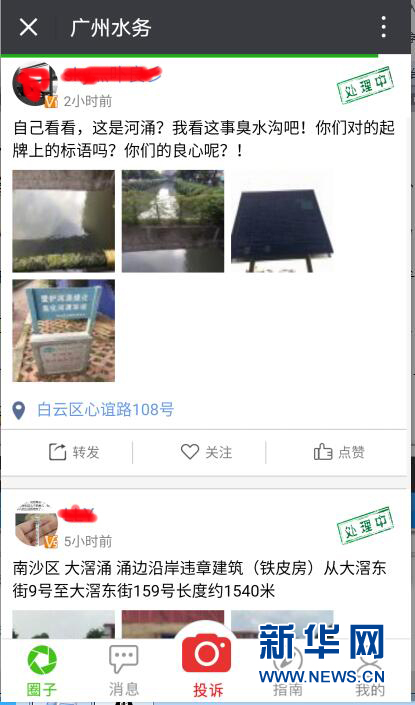 圖為“廣州水務”微信公眾號水污染投訴平臺截屏。新華網 記者盧鑒 攝
