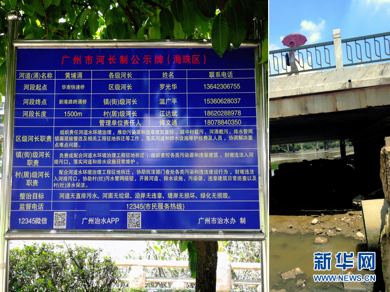 左圖:廣州海珠區(qū)黃埔涌新港東路段“河長制公示牌”上印有投訴的微信二維碼。右圖:橋上路過的人觀看黃埔涌排水口。新華網記者 盧鑒 攝