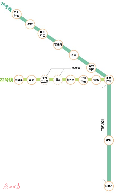 根據(jù)批復(fù),22號(hào)線由番禺廣場至白鵝潭,連接廣州南站和白鵝潭樞紐,全長31公里。線路共設(shè)番禺廣場、白鵝潭6座車站!盀闈M足沿線番禺、荔灣區(qū)發(fā)展和市民出行需求,預(yù)留西三和東沙工業(yè)園2座車站!庇捎趪野l(fā)改委批復(fù)的廣州新一輪地鐵建設(shè)規(guī)劃時(shí)沒有這兩站,因此,需要在下階段進(jìn)一步深化論證,并完善相關(guān)手續(xù)。