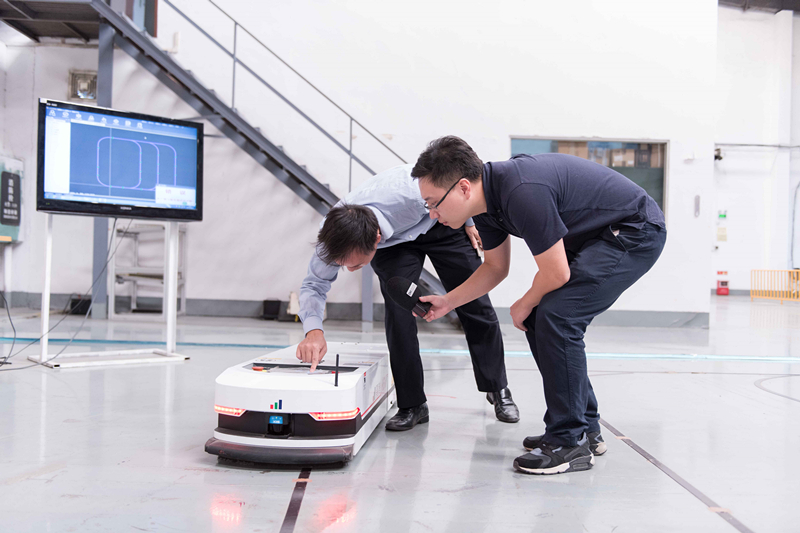 早上8點(diǎn),剛結(jié)束休假的陳洪波趕到公司。今天要來(lái)好幾撥客戶。在機(jī)器人生產(chǎn)車間,頭頂接收器、腳踩四個(gè)輪、身披黃外套的“大黃蜂”正自如地挪動(dòng)。它是一個(gè)搬運(yùn)機(jī)器人,能拖載2.5噸重的東西,可遠(yuǎn)程操控,可室外運(yùn)行,不用軌道,更能適應(yīng)復(fù)雜的工作環(huán)境。