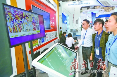 廣東展團的一家參展企業(yè)展示四維藝術(shù)機器人,觀眾站在屏幕前就能“變”成古典名畫的人物。南方日報記者 朱洪波 攝