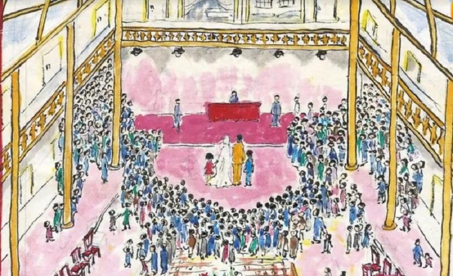 但其實(shí)最初,高春霞并不了解兩位老人的愛(ài)情故事。直到老人的五位子女找到她,帶著《平如美棠》那本書(shū),她無(wú)意中翻時(shí)才知道這是非常平凡而相親相愛(ài)的一家。根據(jù)書(shū)中饒平如畫(huà)的一張夫婦倆當(dāng)年在大禮堂結(jié)婚的圖片,高春霞萌生了“用還原兩位逝者婚禮的形式”來(lái)舉行合靈儀式的想法。