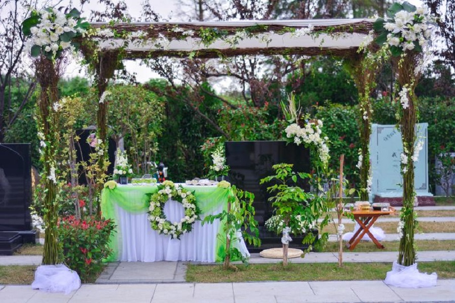 白玫瑰,綠帳幔,小風(fēng)鈴,水晶吊墜,羅馬柱,以及用若干老照片做成的“時(shí)光通道”,上面是一對(duì)夫婦從黑發(fā)到白頭的合影留念。如果沒(méi)有看到桌面上擺放的兩只靈盒,許多人可能會(huì)誤以為這是一對(duì)金婚夫婦的紀(jì)念日現(xiàn)場(chǎng),畢竟鮮少有人能將這些唯美而溫馨的元素與葬禮聯(lián)系到一起。
