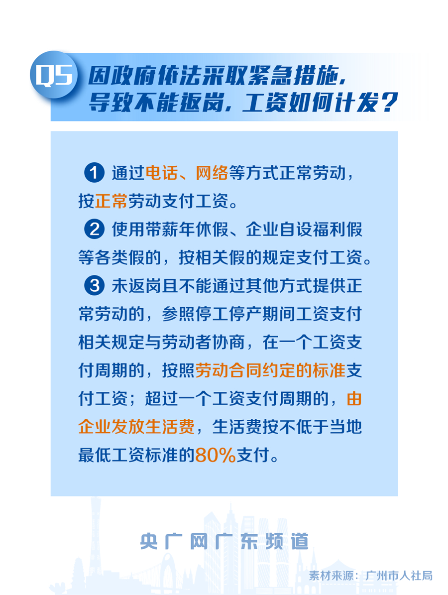 另外,受疫情影響不能返崗,勞動者的工資應(yīng)如何計(jì)發(fā)?被依法隔離時(shí),工資又該如何計(jì)發(fā)?日前,廣州市人力資源和社會保障局也給出了相關(guān)回應(yīng)。