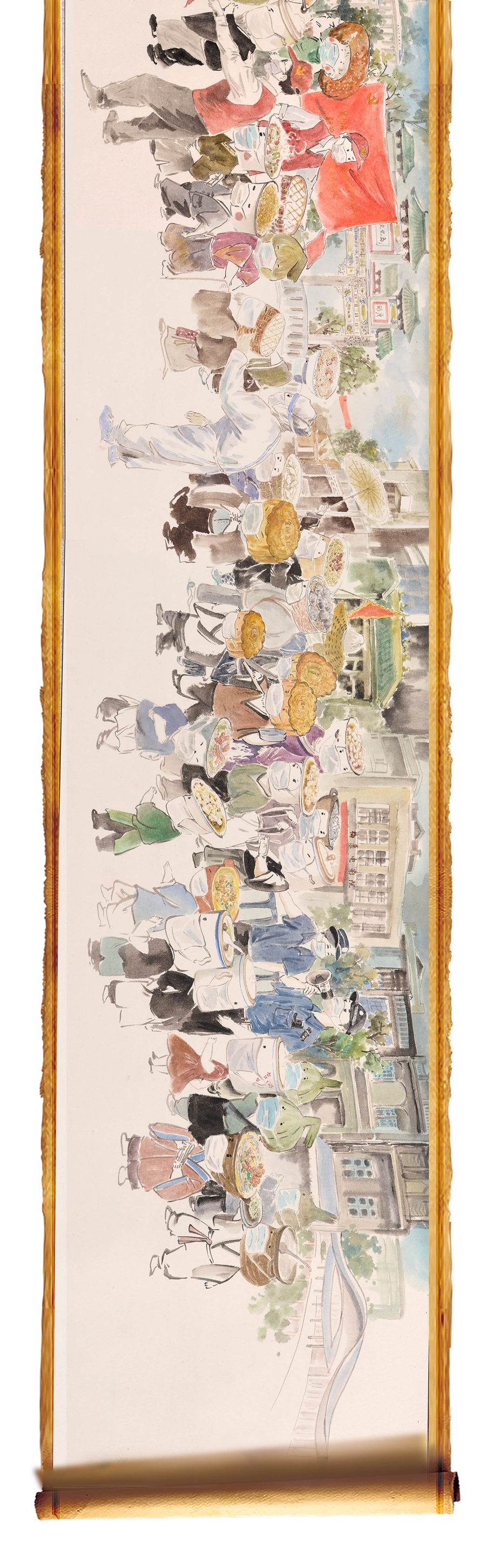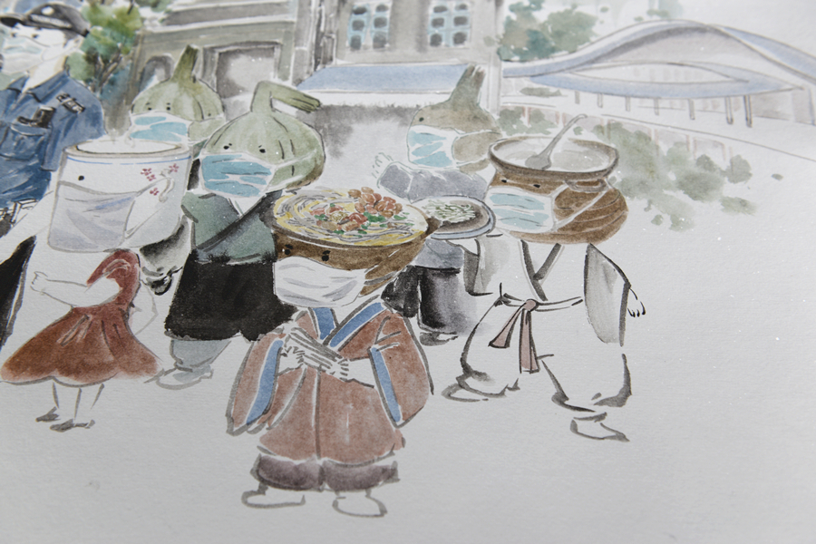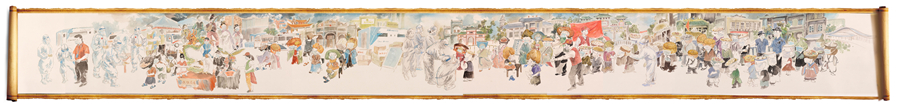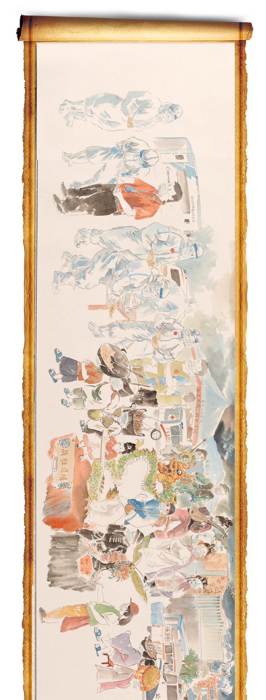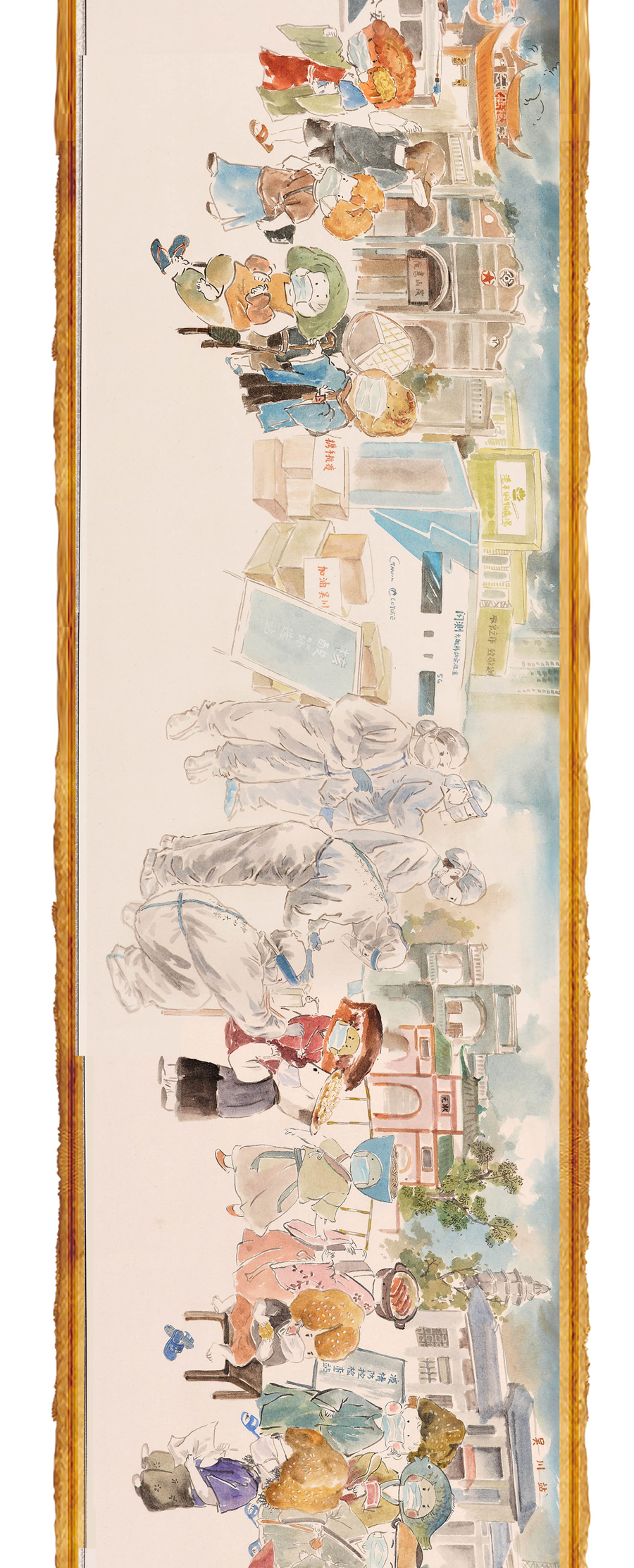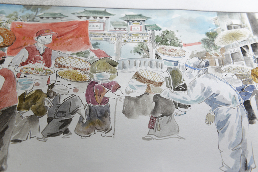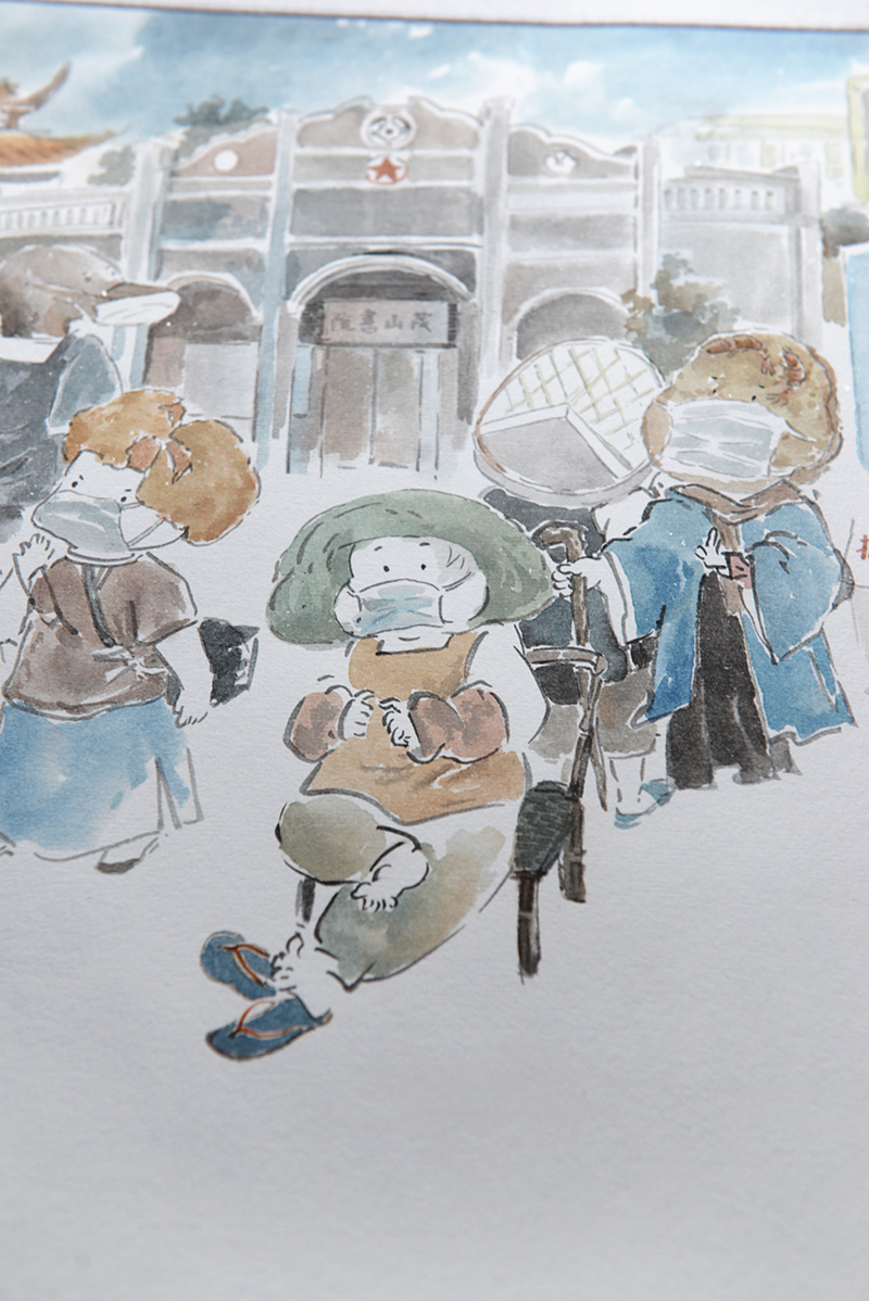 “吳川卷寄托的是我對家鄉(xiāng)的思念,所以在構(gòu)圖上也會更直白一些,就是用長卷的形式,把大家排隊做核酸的場景表現(xiàn)出來!标愔窘芙忉屨f。
