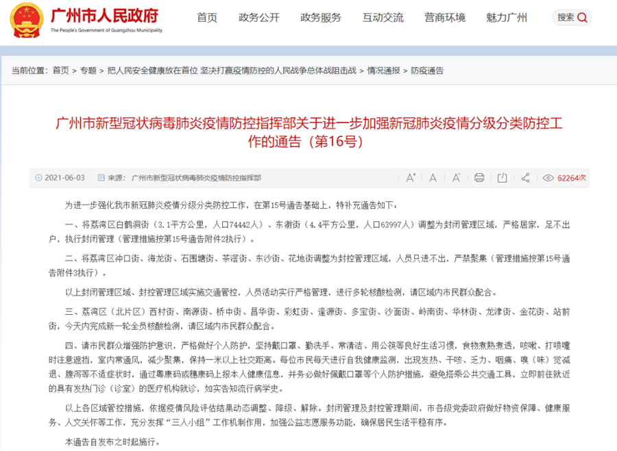 央廣網(wǎng)廣州6月3日消息(記者夏燕)記者了解到,為落實(shí)《廣州市新型冠狀病毒肺炎疫情防控指揮部關(guān)于進(jìn)一步加強(qiáng)新冠肺炎疫情分級(jí)分類防控工作的通告(第16號(hào))》的要求,按照廣佛聯(lián)防聯(lián)控的思路,以“保障過(guò)境交通、切斷內(nèi)部交通”的原則,對(duì)封閉、封控區(qū)域(荔灣區(qū)石圍塘街、花地街、茶滘街、海龍街、中南街、白鶴洞街、沖口街、東漖街、東沙街,即以東、南、北部以珠江水系為界,西部以石圍塘街、茶滘街與佛山接壤的部分區(qū)域?yàn)榻纾⿲?shí)施臨時(shí)交通管理措施如下: