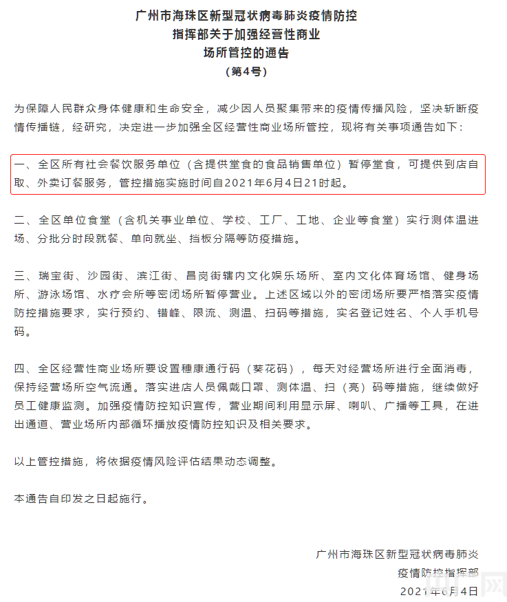 通告明確,海珠區(qū)全區(qū)所有社會餐飲服務(wù)單位(含提供堂食的食品銷售單位)暫停堂食,可提供到店自取、外賣訂餐服務(wù),管控措施實施時間自2021年6月4日21時起。