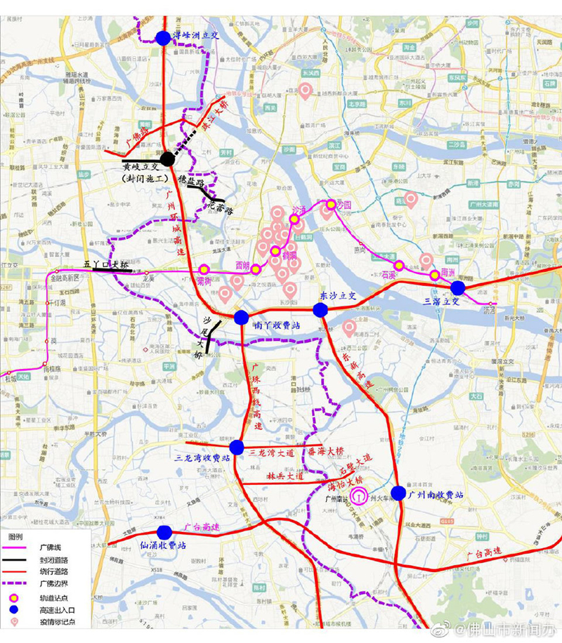 地方道路方面,結(jié)合廣州市封控區(qū)域道路管控情況,對佛山與廣州市封控區(qū)域接壤的道路:廣佛新干線(因道路施工前期已封閉)、穗鹽路、五丫口大橋、沙尾大橋等全部實施雙向封閉。