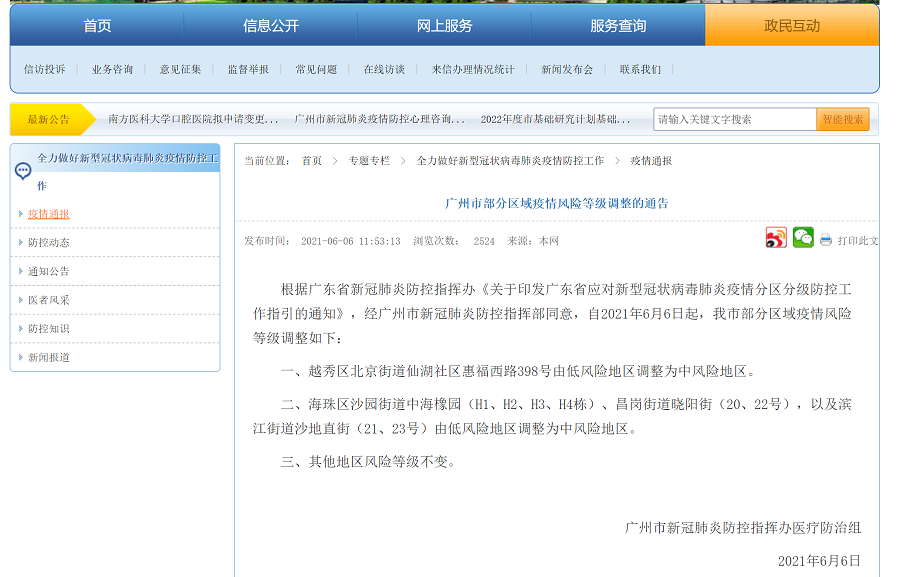 央廣網(wǎng)廣州6月6日消息(記者 張勝強(qiáng))根據(jù)廣東省新冠肺炎防控指揮辦《關(guān)于印發(fā)廣東省應(yīng)對新型冠狀病毒肺炎疫情分區(qū)分級防控工作指引的通知》,經(jīng)廣州市新冠肺炎防控指揮部同意,自2021年6月6日起,我市部分區(qū)域疫情風(fēng)險等級調(diào)整如下: