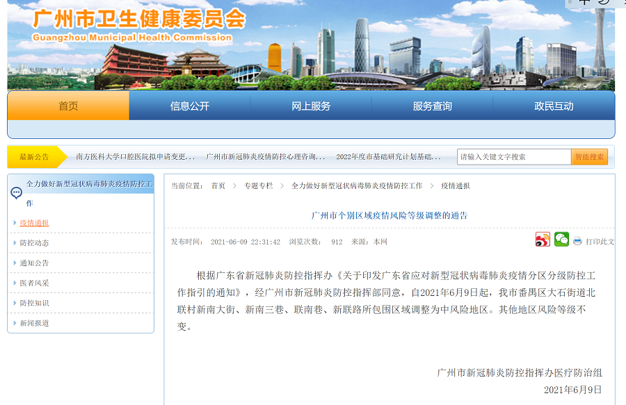 自2021年6月9日起,廣州市番禺區(qū)大石街道北聯(lián)村新南大街、新南三巷、聯(lián)南巷、新聯(lián)路所包圍區(qū)域調(diào)整為中風險地區(qū)。