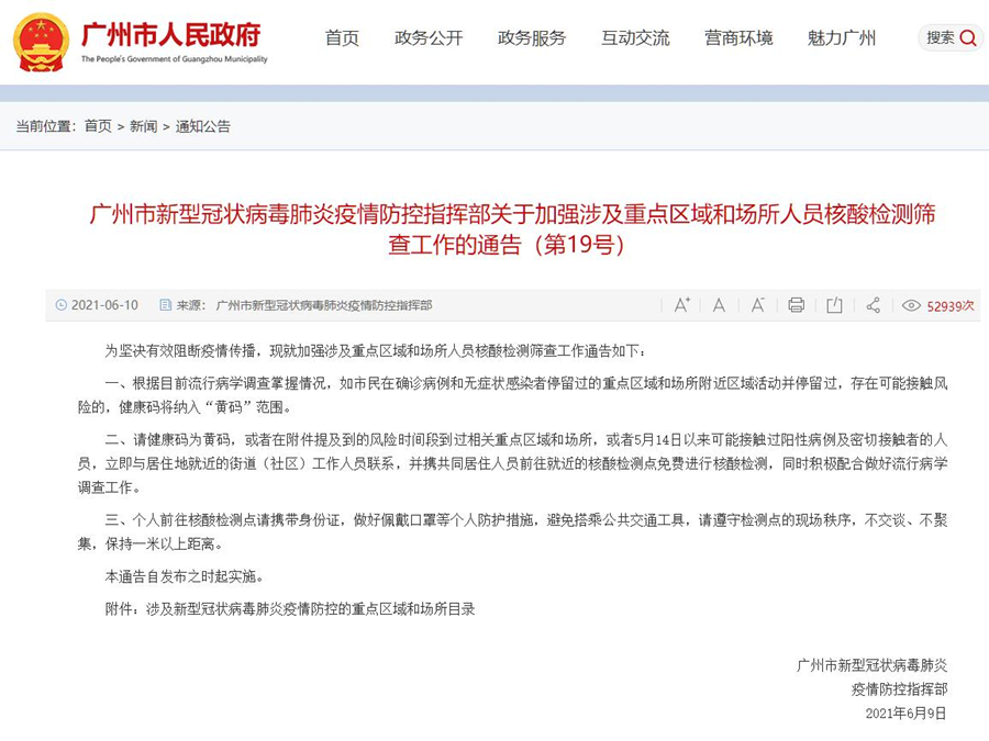 央廣網(wǎng)廣州6月11日消息(記者 夏燕)6月10日晚,廣州市新型冠狀病毒肺炎疫情防控指揮部發(fā)布關(guān)于加強(qiáng)涉及重點區(qū)域和場所人員核酸檢測篩查工作的通告(第19號):即日起,加強(qiáng)涉及重點區(qū)域和場所人員核酸檢測篩查。
