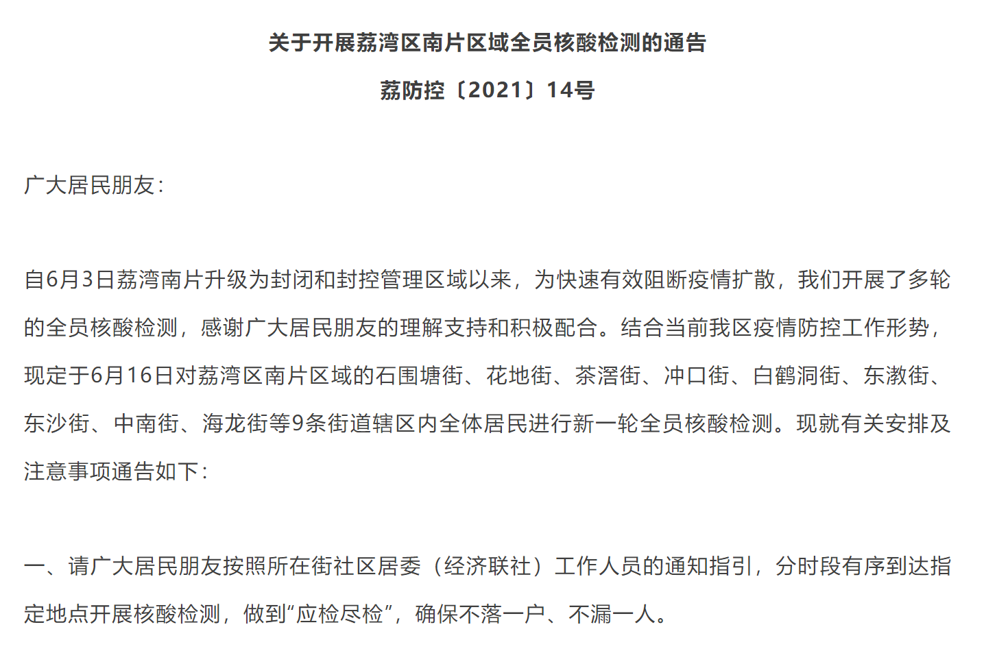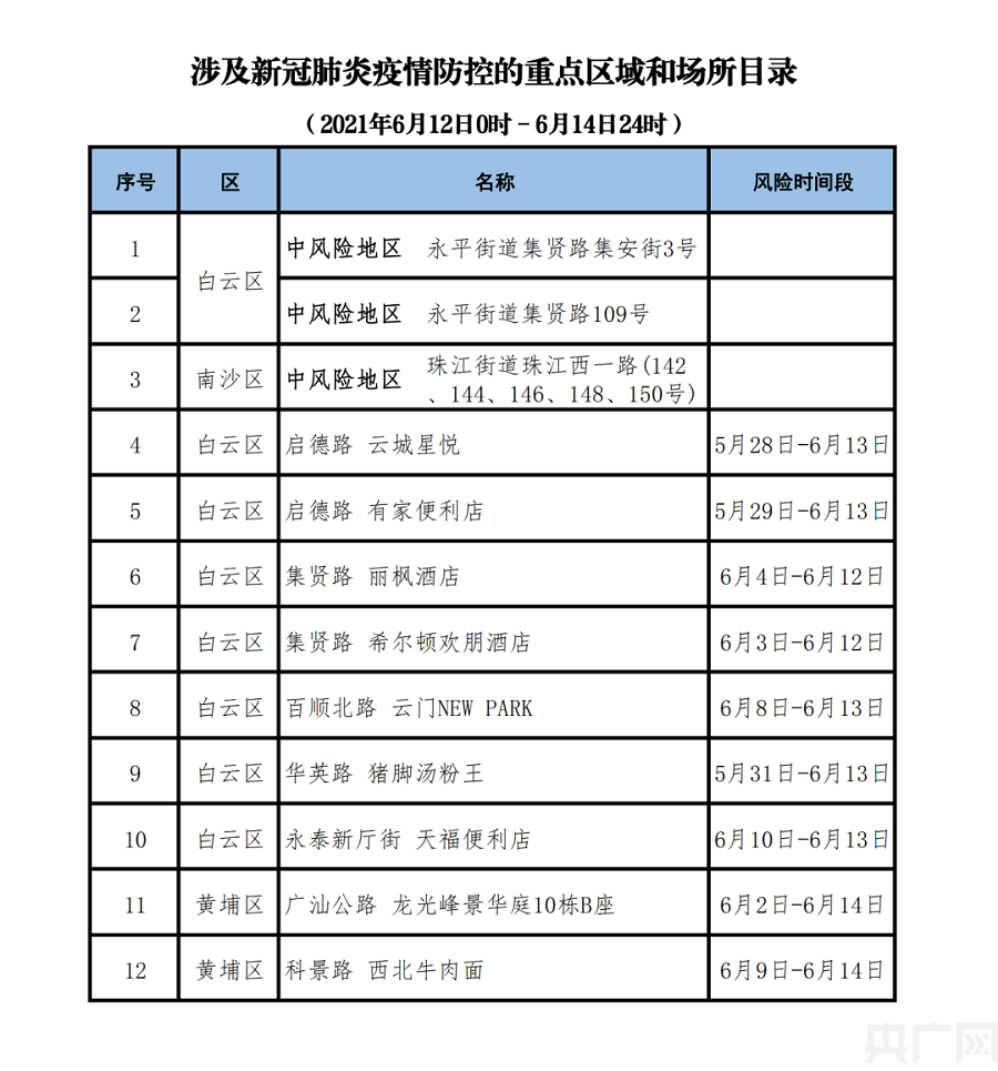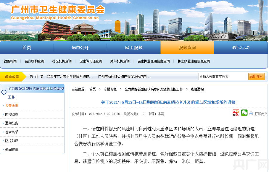 央廣網(wǎng)廣州6月15日消息(記者 張勝強(qiáng))6月15日晚,廣州市衛(wèi)健委網(wǎng)站發(fā)布了關(guān)于2021年6月12日-14日期間新冠病毒感染者涉及的重點(diǎn)區(qū)域和場所的通報(bào):